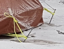 As I mentioned above, I use nails for my winter camping. They will hold, even when you try to get them out of the ground. To remove them, start hammering the sides of the nail above the ice to make the hole bigger. Once the nail is loose, tie a Prusik Knot around the nail and yank until it comes out. Watch your eyes, the nails comes out with force.